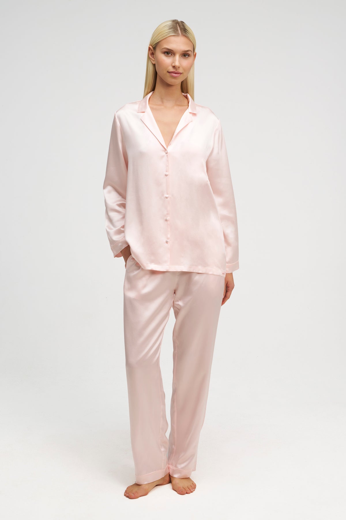 The Silk PJ Long Set is made from 22 Momme Mulberry Silk, offering a luxurious and smooth fabric experience.